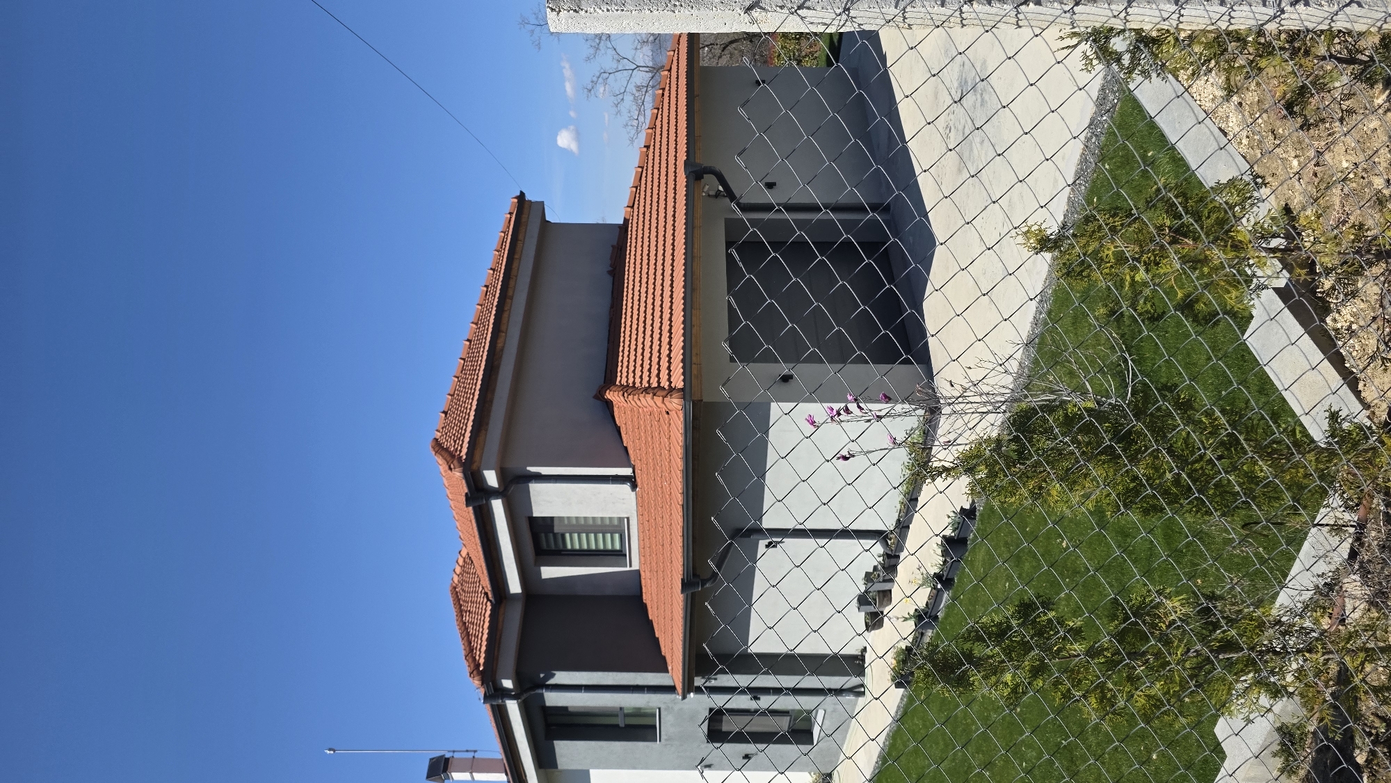 An eye-level, outdoor shot depicts a building with a red-tiled roof against a clear blue sky, partially obscured by a chain-link fence. The building has a modern architectural style with a gray and white color scheme. The fence runs diagonally across the frame, with a grassy lawn and concrete paving stones visible behind it. The scene appears to be in a residential area. Specific details suggesting the location is Marulevo, Bulgaria, are not discernable from the image itself.