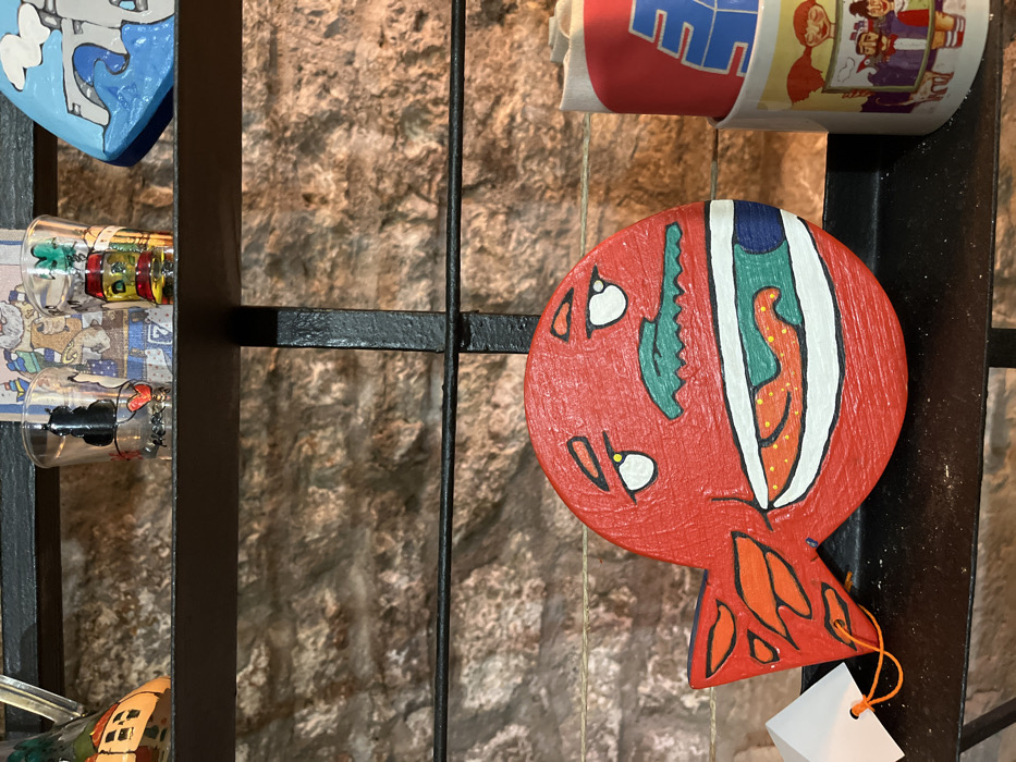 A red, round wooden decoration with a fish-like shape hangs on a black metal display rack. The decoration features whimsical painted details, including a large stylized eye with white, blue, green, and orange colors, and two smaller eyes on the left. The "tail" of the fish is orange with flame-like markings. A white tag is attached to the bottom with an orange string. The rack also displays other items, including glasses and a rolled-up poster with cartoon figures. A textured stone wall is visible in the background.