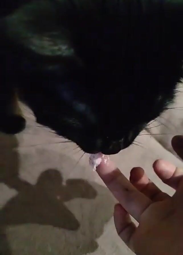 A close-up shot shows a black cat licking a white substance off of a person’s finger