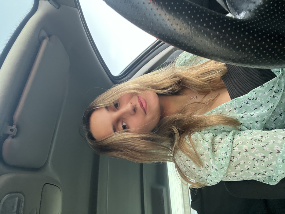 The image displays a young adult female occupying the driver's seat of a stationary passenger vehicle, located within the city of Porto, Portugal. The female, positioned centrally and angled slightly to the left, has long, light brown hair parted centrally, dark eyes, and is wearing a light green blouse with a white floral pattern over a dark, ribbed undershirt. A silver-colored necklace with a small pendant is visible at her throat. She exhibits a subtle smile with her head tilted slightly, making direct eye contact with the camera. The vehicle's interior features a light grey headliner, an overhead console, and a beige sun visor. A dark, textured steering wheel is partially visible on the right side of the frame. Through the side window, a uniformly bright, light-colored sky is discernible, providing ambient light to the scene. The overall lighting suggests daylight conditions.