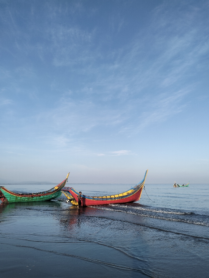 - "Two colorful boats, one green and one red, rest on a dark sandy beach with gentle waves" by FM-sAcf03, licensed under CC BY 4.0