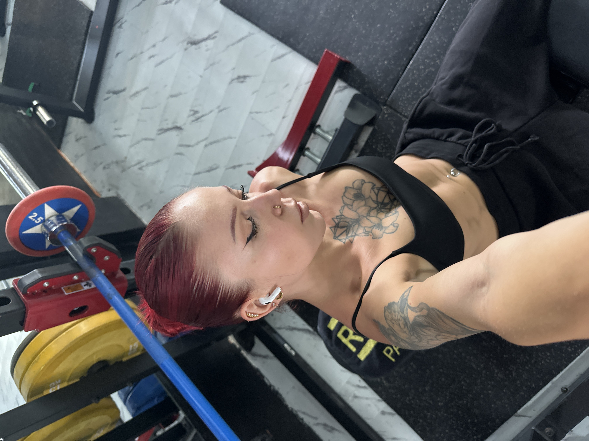 A woman with red hair is in a gym. She is lying on a bench in black workout clothes, including a sports bra and sweatpants. Tattoos are visible on her chest and arm. She is wearing wireless earbuds. Weightlifting equipment, including a barbell with plates, is nearby. The gym floor is covered in gray and white tiles. The gym is located in the city of Tibubeneng, Indonesia.