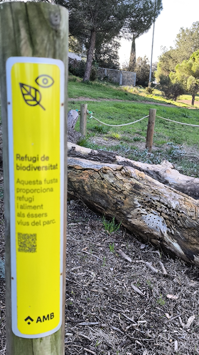 The image displays an outdoor scene within a park or green space in Cerdanyola del Vallès, Spain. In the left foreground, a wooden post supports a vertical, rectangular yellow sign. The sign features a stylized eye icon and a leaf icon at the top, followed by Catalan text reading "Refugi de biodiversitat" (Biodiversity refuge) and an explanation that the wood provides shelter and food for park inhabitants. A QR code and the "AMB" (Àrea Metropolitana de Barcelona) logo are present at the bottom of the sign. To the right of the post, two large, unhewn logs, exhibiting weathered bark and discoloration, rest horizontally on a ground covered with mulch, wood chips, and sparse green vegetation. One of the logs displays a pattern of multiple drilled holes. A low barrier constructed from wooden posts and a white rope runs horizontally across the mid-ground. Beyond this barrier, a grassy slope leads to a background dense with various trees, including tall conifers, and a section of a chain-link fence partially obscured by foliage. No individuals are depicted in the scene.
