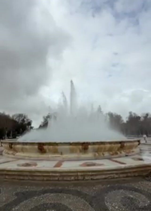 large, multi-tiered fountain spraying water high into the air. The fountain is circular and made of light-colored stone with decorative details. The ground around the fountain is paved with a black and white mosaic pattern. In the background, there are trees and a cloudy sky. A person can be seen walking in the distance.