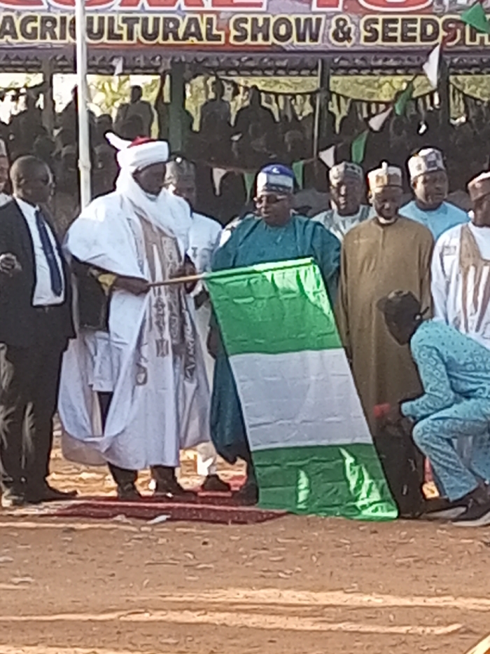 An outdoor shot features a group of men at an "Agricultural Show & Seeds" event. Most wear traditional clothing; one is in a suit. A man in white robes and a red fez holds a Nigerian flag. Another man in green stands beside him. A banner is visible in the background, with more people behind it. A person in blue kneels near the flag's edge. The setting appears to be a sandy or dirt surface.
