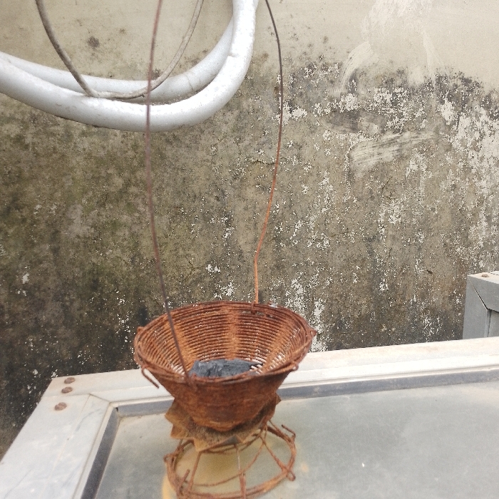 - "The image displays a rusted, cylindrical wire basket, functioning as a small stove or censer, situated on a metallic surface against a textured wall in Madalla, Nigeria" by FM-JdNk53, licensed under CC BY 4.0