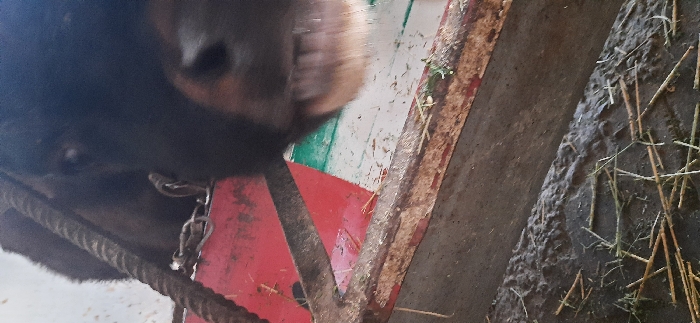 A close-up, blurry shot shows the snout and part of the head of a dark animal, likely a cow, tethered with a rope and chain. The animal is near a structure with a red and green painted section. A weathered metal frame or support is visible, along with a concrete surface covered in mud and scattered straw or hay. The overall image is somewhat obscured and lacking in sharp detail.