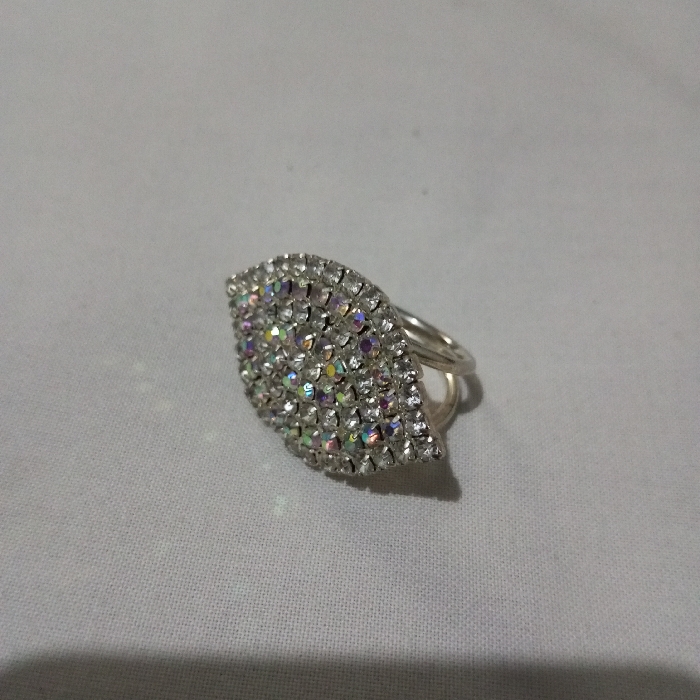A silver ring with a leaf-shaped head dominates the frame. The ring's head is densely packed with small, iridescent rhinestones that catch the light. The band is a simple, double ring of silver. It casts a small shadow on the white fabric backdrop. The overall composition is simple, focusing attention on the jewelry item.