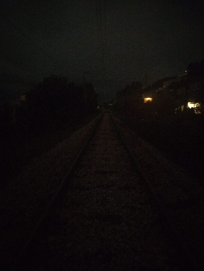 A dark photograph shows a set of railroad tracks disappearing into the distance under a heavy, dark sky. The tracks lead through a dark area with thick vegetation on either side. Faint, blurred lights from buildings are visible to the right, contrasting with the darkness. Power lines are slightly visible above the tracks. The focus is on the receding perspective of the railway.