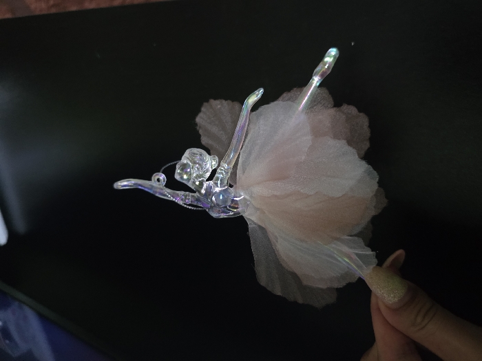 - "This image depicts a translucent, iridescent ballerina ornament held by a human hand against a dark, flat surface, likely a table or desk, in Staliyska mahala, Bulgaria" by FM-qf9aI2, licensed under CC BY 4.0