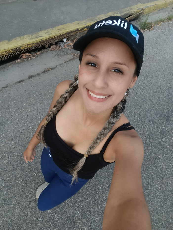A woman is depicted in a high-angle selfie, smiling directly at the camera. She has light-toned skin, dark eyes, and two long braids with prominent blonde/gray highlights secured by light brown elastic bands. She wears small hoop earrings with white pearls. Her attire includes a black baseball cap with reversed white text "LiLute" and a light blue stylized symbol on the front, a black spaghetti strap tank top, navy blue athletic leggings, and light-colored athletic shoes. The ground is gray asphalt pavement. In the upper left background, a yellow-painted concrete curb is visible, worn and partially obscured by dried leaves and debris. Below the curb, a drainage channel with a metal grate is present, also partially filled with debris. A sliver of clear sky is visible in the upper right. The scene is located in Las Tejerías, Venezuela.