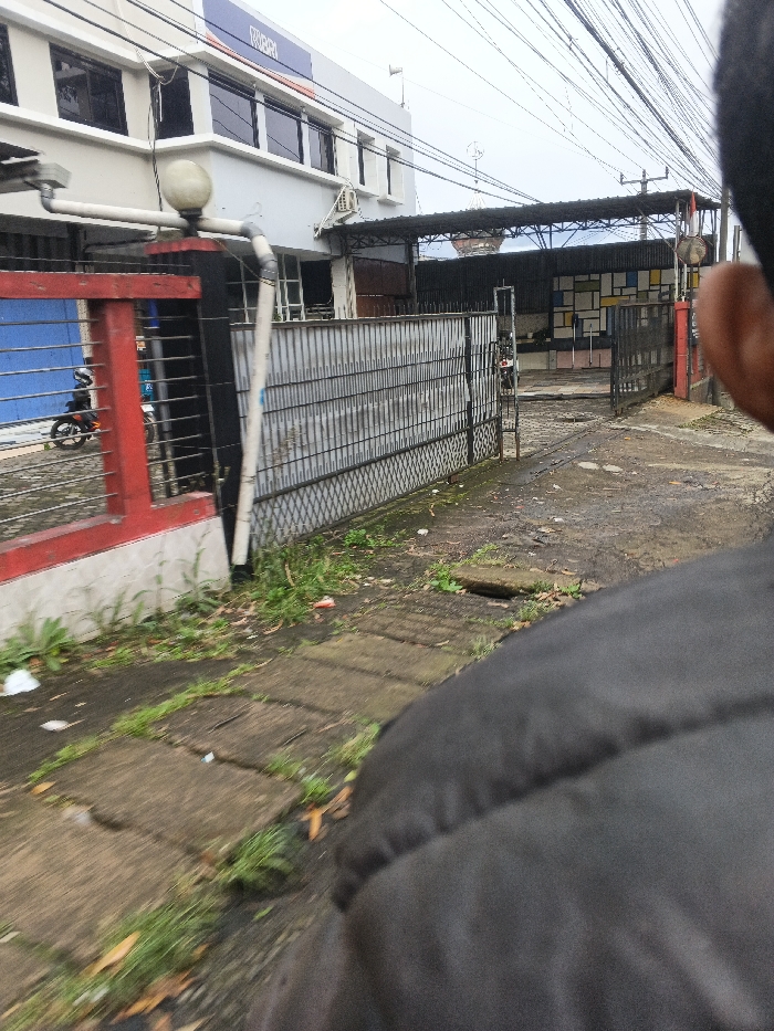 The image captures a street scene in what is specified as Kadoma, Zimbabwe. In the blurred foreground, the right shoulder and upper arm of an individual wearing a dark, possibly padded jacket are visible. The midground features a red and white painted concrete and metal fence structure to the left, which partially obscures a small, dark motorcycle with a rider moving on an asphalt road behind it. Across the center, a grey metal fence with a diamond pattern marks an open entrance to a paved area. A single, light-colored lamp fixture is affixed to a red fence post on the left. The prominent background building is a two-story, light-colored commercial structure displaying a blue and white "BRI" bank logo on its upper facade, with dark-paned windows on both levels. An external air conditioning unit is affixed to the building's wall. To the right of this building, a dark, open-framed canopy or roof structure extends over a paved area. A brightly colored, abstract geometric wall, composed of yellow, light blue, white, black, and brown rectangles, is visible behind the grey fence. The ground is a worn concrete path with cracks and patches of green vegetation, alongside scattered litter. Numerous overhead power or communication lines are visible against the overcast sky.