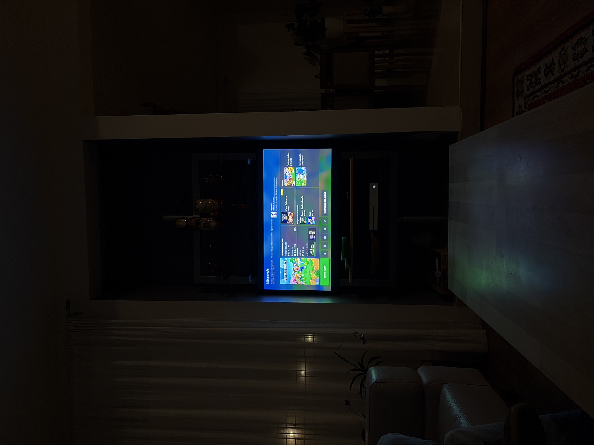 Here's a matter-of-fact description of the image: **Scene:** A dimly lit room, likely a living room, at night. **Objects:** A large flat-screen television is the focal point, displaying the main menu for the video game "Minecraft." Below the TV is a hardwood floor, reflecting light. To the right is a light-colored leather couch and coffee table. In the dark background is an Xbox console next to the TV. **People:** A person is visible seated on the couch. **Environment:** The room is very dark, making it difficult to discern details. There are shadows cast throughout. **Location:** The image does not contain information about the location of the city of Cholula, Mexico.