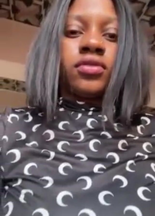 A person with brown skin, wearing a black, long-sleeved shirt with white crescent moon patterns, looks directly at the camera from a low angle. The person has shoulder-length gray hair and is standing indoors with a decorative ceiling visible above. The camera is steady, showing only slight movements.