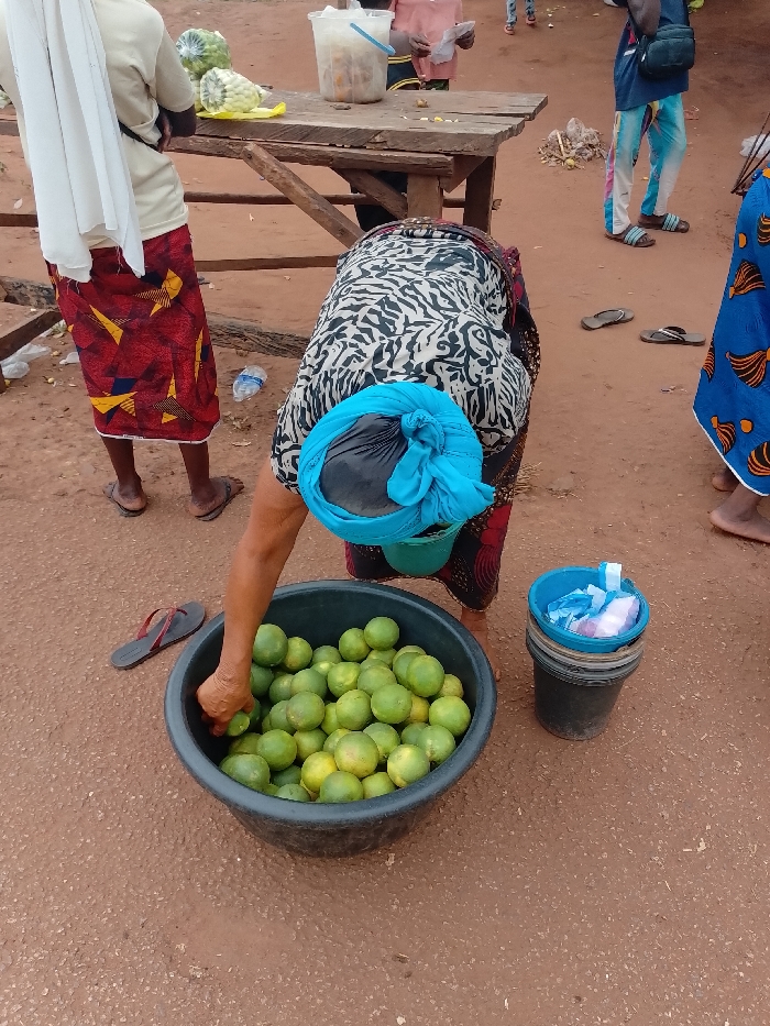 A person leans over a large black bowl filled with green citrus fruits. They have one hand inside the bowl. The person wears a patterned dress and a blue head wrap. Several other people stand nearby, some wearing colorful clothing. There's a small wooden table holding produce in the background. A stack of blue and black buckets sits next to the bowl of citrus. The ground is reddish-brown.