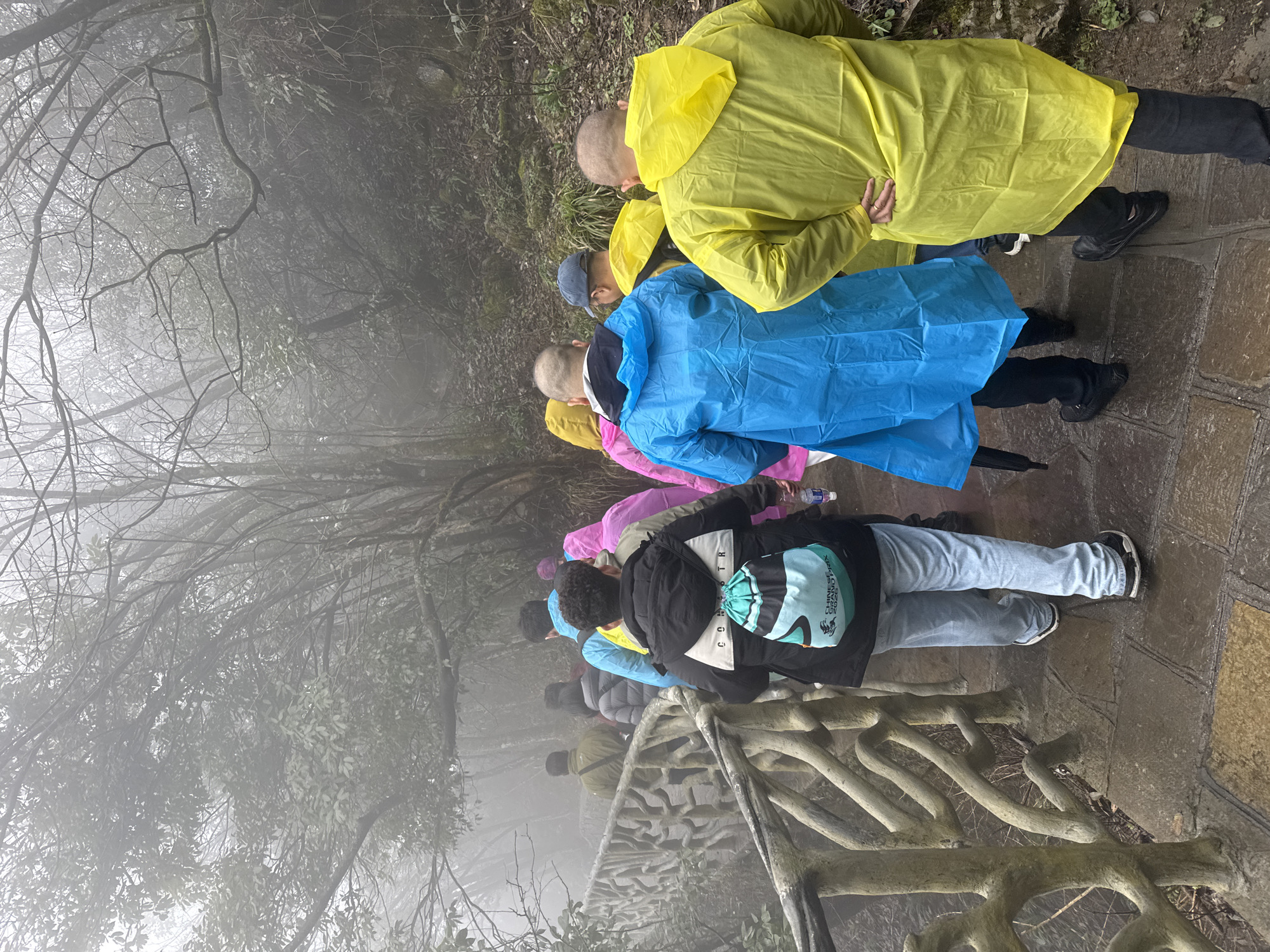 The image captures a group of approximately ten individuals walking along a wet, stone-paved path in a misty, forested area within Yongding District, China. Dense fog or mist significantly reduces visibility, obscuring backgrounds beyond roughly 15-20 meters. The environment features both bare deciduous trees and evergreen foliage lining the path, with a steep, vegetated slope rising on the right. A decorative concrete or stone railing, carved with gnarled, intertwining patterns, borders the left side of the path. The individuals are viewed from the rear, proceeding in the same direction, away from the camera. Most are clad in brightly colored disposable rain ponchos—predominantly blue, yellow, and pink/purple—suggesting wet weather conditions. The foremost figure in the center wears a black jacket with a white and gray section, light blue jeans, and black sneakers, carrying a light blue drawstring bag emblazoned with "CHINESE GRAND PRIX 2023" text and a logo. To their immediate right, another individual wears a yellow poncho, with their hands positioned on their hips. Adjacent to this person, a third individual wears a blue poncho and holds a closed black umbrella. Several of the visible individuals, including those in the foreground, have shaved heads or very short hair. One person further back is observed holding a clear plastic water bottle. The path's surface is visibly wet, with accumulated water in various depressions.