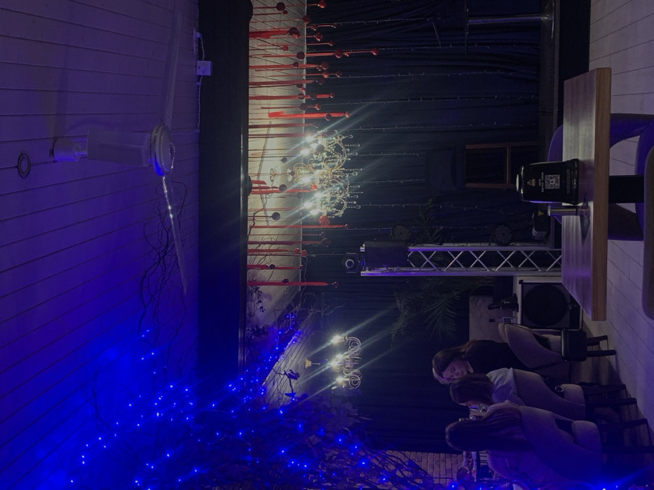 An outdoor scene at night features a building facade with a ceiling fan, adorned with blue string lights and branches