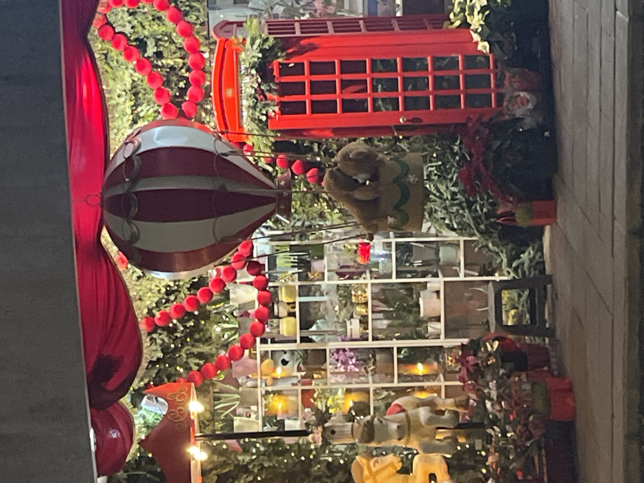 A whimsical holiday display features a red and white striped hot air balloon connected by a string of red beads to a toy-sized red London phone booth. A stuffed bear appears to dangle from the balloon. A shelving unit behind showcases various trinkets and miniature items. The scene is bordered by red curtains on the left and a textured wall on the right. Lights twinkle amidst foliage, contributing to a festive ambiance.