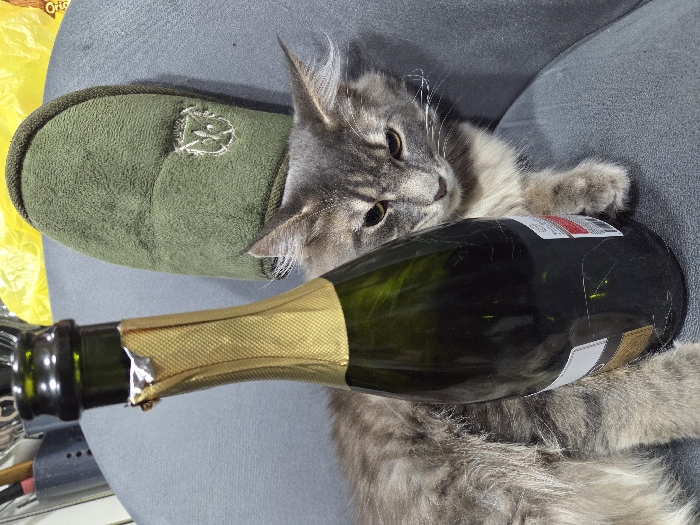 An indoor scene in Chaikovsky, Russia, depicts a long-haired domestic tabby cat, primarily grey and beige, positioned on a grey upholstered surface. To the left of the cat, a dark green sparkling wine bottle stands upright, its gold foil neck partially torn near the top, revealing a silver foil layer. The cat's head is visible on the right, looking downwards and slightly to the left with narrowed eyes, its left paw resting near the base of the bottle. A single olive-green fuzzy slipper, featuring a white embroidered crest design, is located in the upper right quadrant, also resting on the grey surface. The background, upper left, reveals miscellaneous objects including metallic utensils in a dark container and a bright yellow plastic bag.