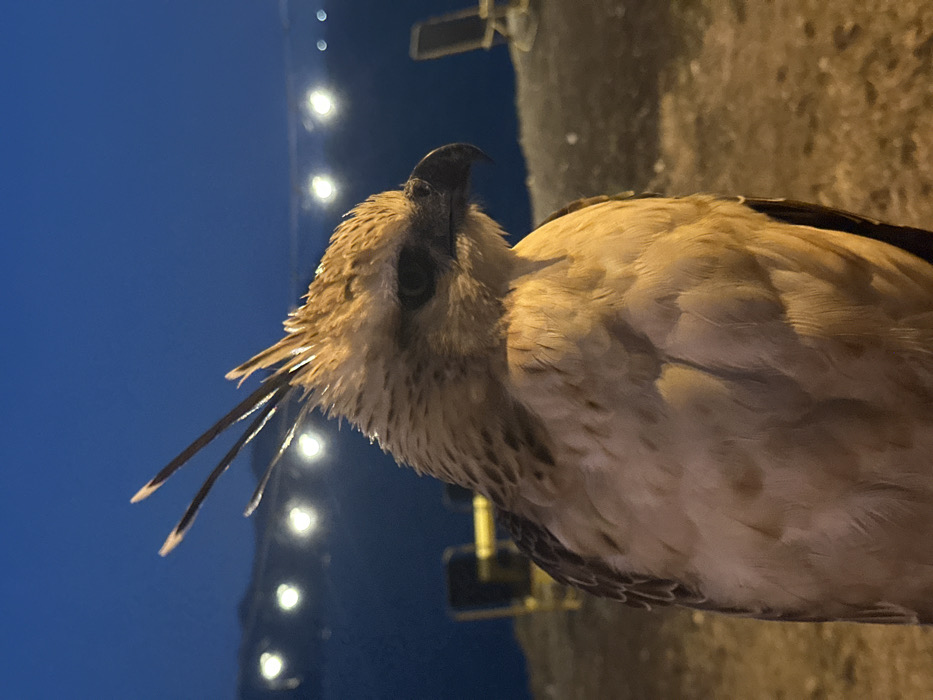A crested raptor, likely a Changeable Hawk-Eagle (*Nisaetus cirrhatus*), is captured in a medium close-up, oriented to the viewer's right. The bird displays light brown to tan plumage on its head and ventral side, contrasting with darker brown feathers visible on its dorsal side. A prominent crest of several slender, dark feathers projects upward from its crown. It possesses dark eyes and a robust, dark, hooked beak. The raptor appears to be perched on an indeterminate, dimly lit, rough ground surface in the foreground. The background features a dark body of water under a dark blue twilight or nighttime sky. A horizontal line of multiple blurred, circular artificial lights is visible across the water, suggesting a distant coastline or maritime activity. Vague, out-of-focus shapes consistent with outdoor chairs are present on both sides of the bird in the midground. The scene is located in Vĩnh Lương, Vietnam.