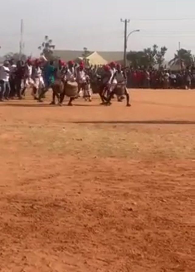group of men dressed in white tunics, red caps, and brown leg coverings playing drums and marching in formation on a dirt field. They are surrounded by a crowd of spectators, some of whom are wearing red clothing. The sky is blue and there are some buildings and trees in the background. The video seems to capture a cultural performance or parade.