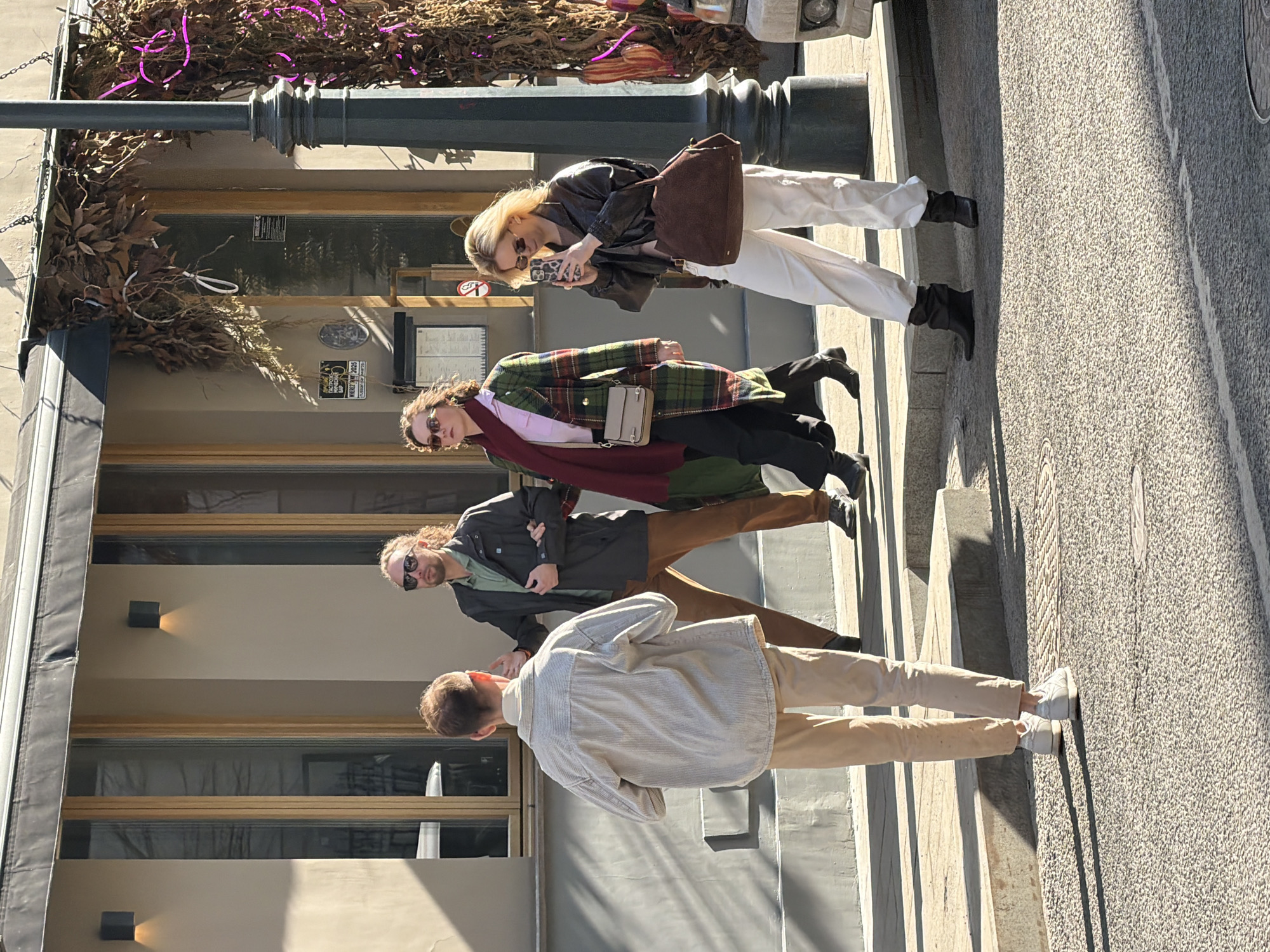 An outdoor daytime street scene in Moscow, Russia, specifically near the building housing "WHERE 2.0. BAR" and "FACETORO WINEMAKER BAR" at Bolshoy Cherkasskiy Pereulok, 15-17с1. The setting is a sunlit urban street featuring a building facade with a dark awning, wooden-framed windows, and two illuminated cube sconces. An ornate black lamppost on the right is decorated with dried foliage and purple neon elements. The ground includes asphalt and a raised concrete sidewalk. A white vehicle's front bumper and headlight are partially visible on the far right. Four individuals are present. A male, observed from the rear, wearing a beige ribbed long-sleeve shirt, a lighter turtleneck, beige trousers, and white sneakers, stands in the foreground. Behind him, a male with long, curly light brown hair, black sunglasses, a green collared shirt, a dark jacket, and brown trousers, walks arm-in-arm with a female. This female has dark curly hair, sunglasses, a dark pink scarf, a green plaid coat, black trousers, and carries a small beige shoulder bag. To their right, a blonde female, wearing sunglasses, a dark brown cropped leather jacket, a light brown top, white wide-leg trousers, and dark ankle boots, holds a smartphone with a leopard print case horizontally with both hands, appearing to photograph. She carries a large brown suede-like bag on her left arm. Distinct shadows are cast across the scene, indicating strong sunlight.