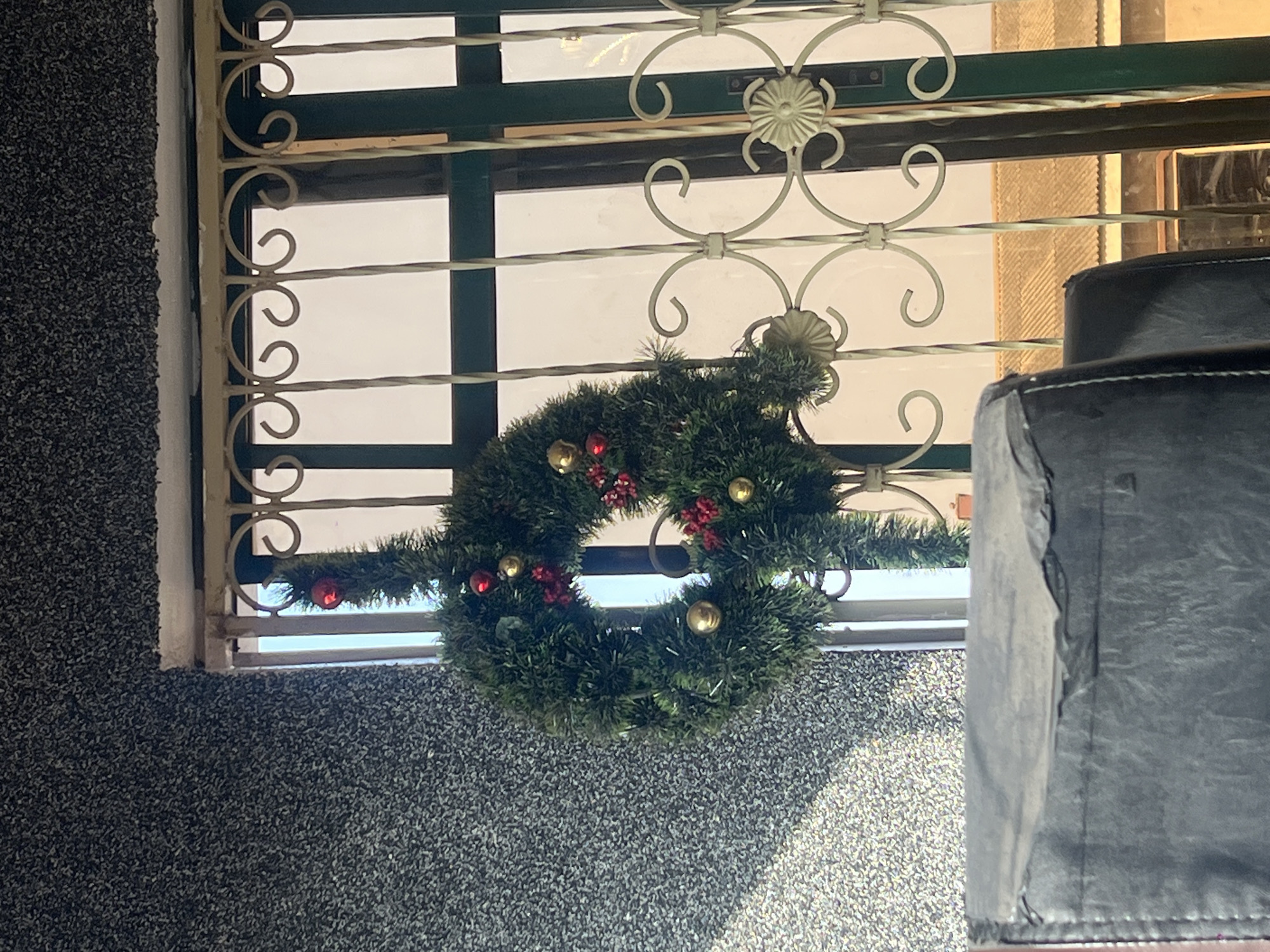 The image displays an indoor perspective looking out through a window in Lagos, Nigeria. A green artificial Christmas wreath, decorated with small red and gold spherical ornaments, hangs centrally, positioned against light-colored, decorative wrought iron security bars. These bars feature curvilinear scrollwork and stylized floral elements. The window frame appears dark. To the left, a dark gray wall exhibits a rough, granular texture. The bottom foreground is occupied by the top section of a dark, possibly black, upholstered chair or furniture, showing visible stitching and a slightly worn appearance. Beyond the window and security bars, the background reveals sections of light brown corrugated metal roofing on adjacent buildings, illuminated by diffused daylight, suggesting an overcast sky. No individuals are present in the scene.
