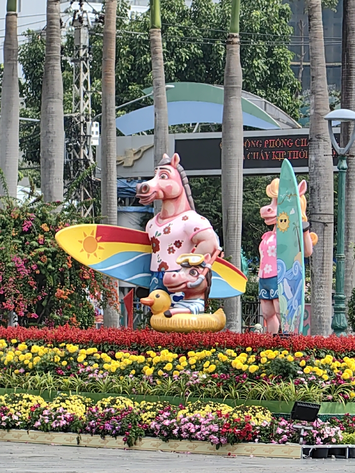 The image displays an outdoor public art installation in Quy Nhon Ward, Vietnam, featuring three anthropomorphic horse-like statues. The central figure is a large pink horse wearing a pink floral shirt and blue shorts, holding a yellow, red, and blue surfboard with a sun graphic. Positioned in front of this horse is a smaller pink horse-like child, wearing a blue and white striped shirt and a yellow snorkel mask, seated in a yellow duck-shaped inflatable ring. To the right, a second pink horse-like figure, depicted with blonde hair, wears a pink floral top and blue shorts, holding a teal surfboard adorned with a sun and wave design. These statues are situated within an elaborate floral arrangement consisting of tiered beds of red, yellow, and pink flowers, interspersed with green foliage. In the background, tall, slender palm trees with green fronds are prominent. A metal lattice structure, possibly a utility pole, and a building with blue arched canopies are visible. A large sign with partial Vietnamese text, including "ONG PHONG CHA" and "CHAY KIP THOI," is partially obscured by trees. A dark green street lamp post stands on the far right. The scene is illuminated by natural daylight.