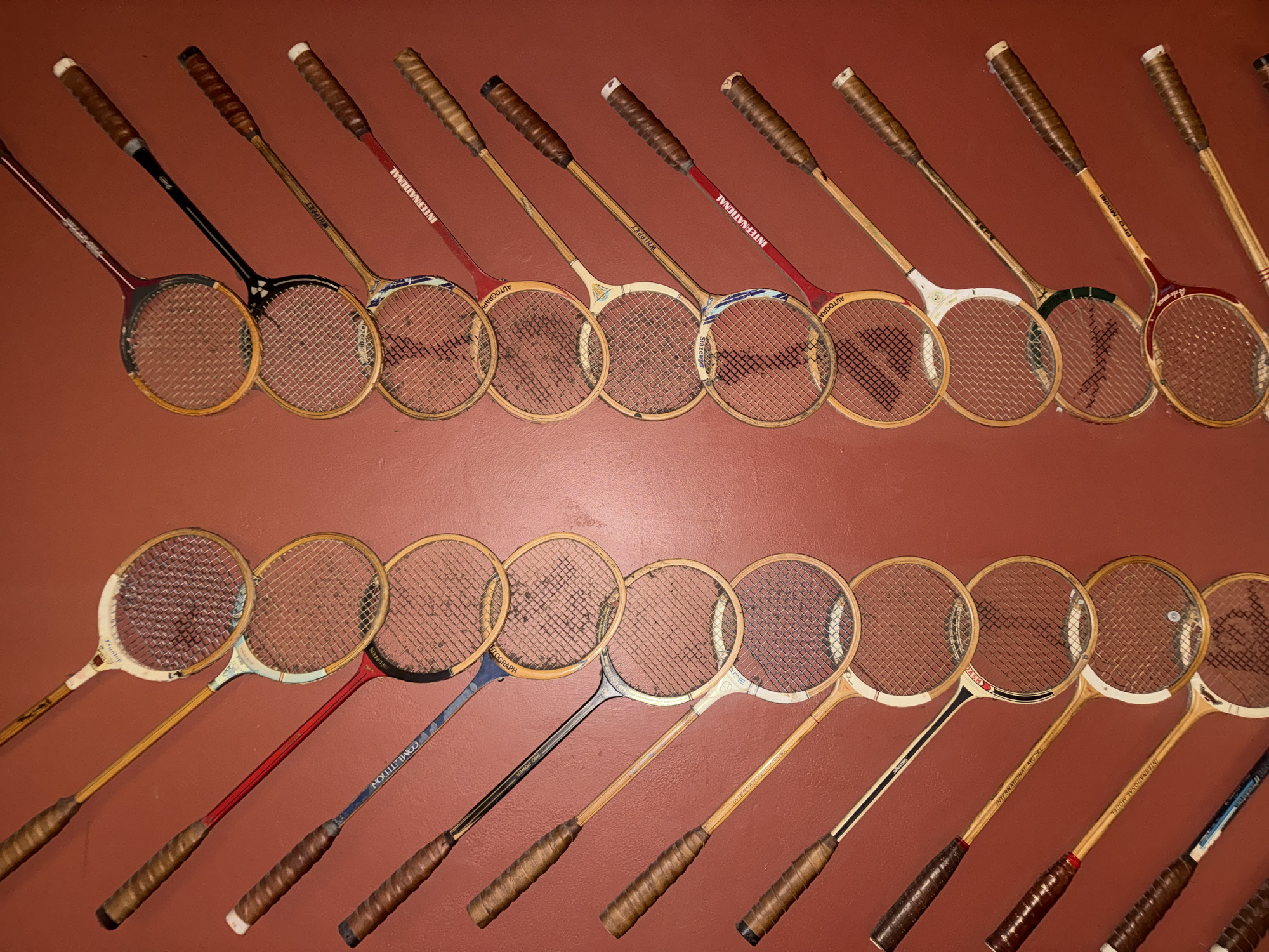 The image displays a collection of vintage badminton rackets arranged in two rows against a reddish-brown wall
