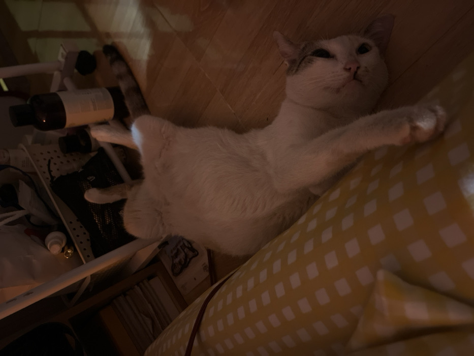 A white cat with gray markings lounges on a yellow and white patterned surface. The cat's paws extend towards the viewer, and its head is tilted slightly back. A shelf cluttered with items, including bottles and a black bag, is visible to the left of the cat. The background includes wooden flooring.