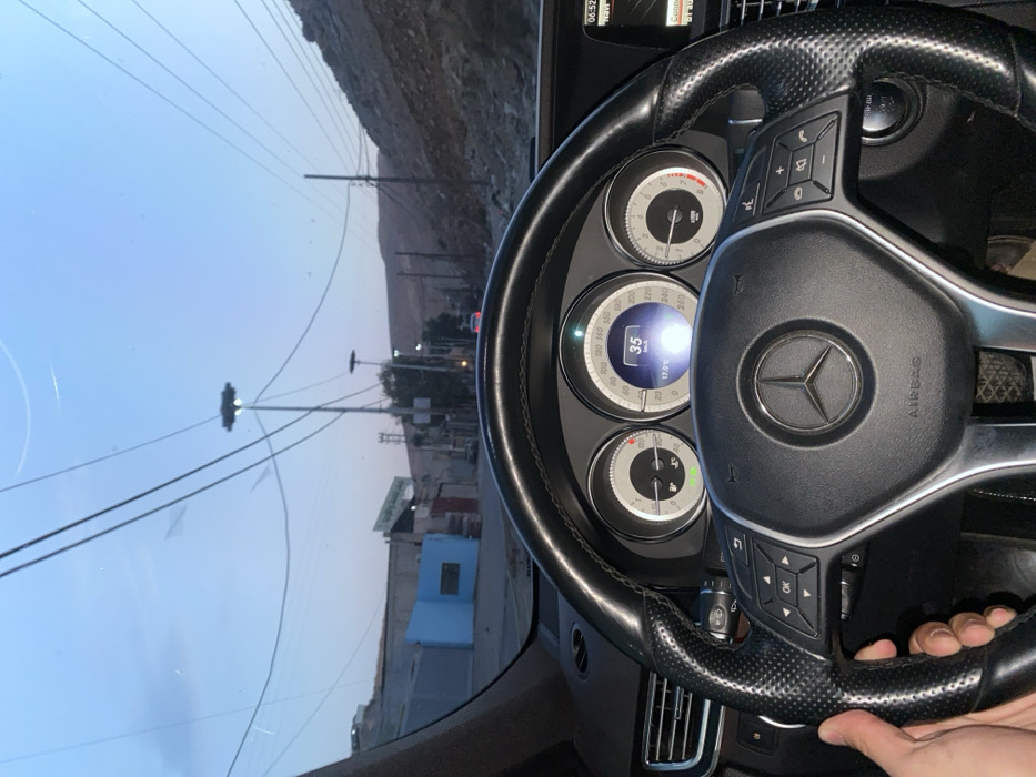The image presents a driver's first-person perspective from inside a Mercedes-Benz vehicle, looking out onto a street in Ma'raba, Syria, at dusk or dawn