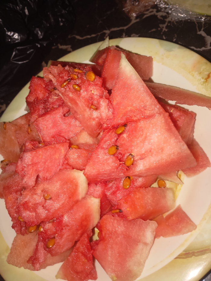 The image displays a close-up, high-angle view of numerous irregularly cut pieces of watermelon piled onto a round, light-colored plate. The watermelon flesh is predominantly a vibrant red, containing multiple visible dark brown to black seeds scattered across the pieces. Some pieces exhibit small portions of the pale pinkish-white rind attached to the red flesh. The plate is white or off-white, with faint, discolored, possibly decorative, yellow-brown markings near its rim. The background is a dark, reflective surface with a marbled or textured pattern, potentially a countertop. A crinkled, translucent, plastic-like material is visible in the upper left background. No individuals, specific actions, or interactions are present in the scene beyond the prepared fruit. This scene is located in Jos, Nigeria.