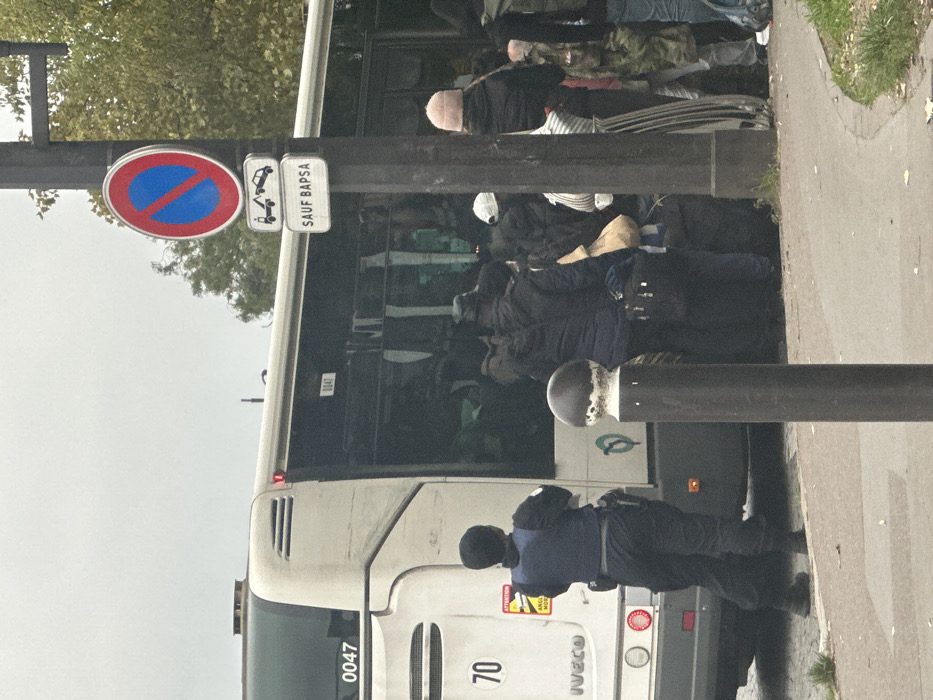 An outdoor scene in Paris, France, depicts a white Iveco passenger bus, route number 70 and unit 0047, parked on a street with its rear door open. A uniformed officer, wearing a dark blue tactical vest and dark uniform, stands at the bus's rear, facing its entrance. A crowd of individuals, dressed in various civilian clothing including dark jackets and hats (one light pink beanie, one white baseball cap), are clustered at and inside the bus entrance, some carrying bags. A dark street pole on the right displays a circular 'no stopping/parking' sign, a rectangular 'tow-away zone' sign, and a rectangular 'SAUF BAPSA' sign. A dark bollard with chipped paint is visible in the foreground. The sky is overcast. The bus exhibits a yellow "Attention Angle Mort" sticker.