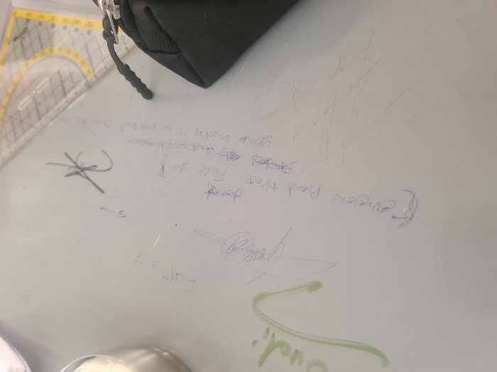 The image displays a close-up, angled view of a light-colored, possibly off-white or light gray, flat surface, situated in Jibb as-Safa, Syria. The surface is extensively marked with various handwritten inscriptions and abrasions. In the upper-left quadrant, a portion of a cylindrical, silver-colored metallic container, appearing to hold a white, fibrous material, is visible. Below and to the right of this, the name "Budi" is written in green, freehand script. Moving towards the center, multiple inscriptions in blue or black ink are present. These include the faint phrase "Fuck off," followed by "Everyone Read That." Further to the right, additional text reads "Fuck you" and "And F***ing Your mom is in my bed." A distinct, stylized asterisk or star symbol, rendered in black ink, is located in the upper-central area of the surface. The lower-right quadrant of the surface exhibits several fine, linear scratches. Partially visible in the upper-right corner is a segment of a yellow plastic protractor or ruler, marked with black numerical and increment lines. Adjacent to the protractor and resting on the surface is a black fabric pencil case or pouch, featuring a silver-colored zipper and a black fabric pull tab. No individuals are depicted.