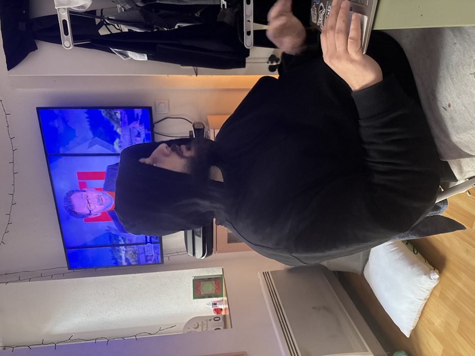 An indoor scene depicts a male individual seated at a light-colored surface, actively typing on a silver laptop. He wears a black hooded sweatshirt with the hood up, partially obscuring his head, and has a beard. His gaze is directed towards the right side of the frame. In the background, a large flat-screen television is mounted on a light-colored wall, displaying a news broadcast from "LCI," a French channel. Text visible on the TV screen's lower banner explicitly mentions "STRASBOURG," indicating the geographical context is Strasbourg, France. Below the television, a black printer/scanner sits on a wooden cabinet. To the far left, string lights cascade down the wall, above a white radiator and a white pillow resting on a light wooden floor. A shelf below the string lights holds a white crescent moon decoration, a red candle, and a small green book. To the right of the seated individual, a clothing rack with dark garments is visible. The man's hands are positioned over the laptop's keyboard, with one hand blurred due to motion.