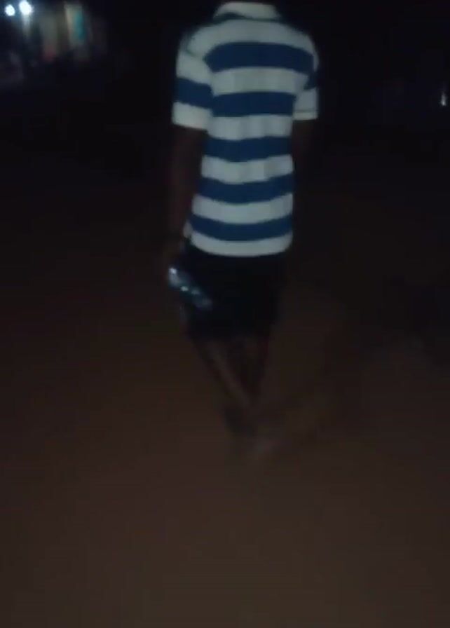 A single person, seen from the back, walks on a dark ground, possibly a dirt road or path. The person is wearing a white and blue striped short-sleeved shirt and dark shorts. They carry an unidentifiable object in one hand. The scene is dark with minimal ambient light. There are some blurred lights in the distance, possibly from a building.