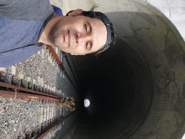 - "A man wearing a baseball cap stands beside a railway track leading into a large concrete tunnel" by FM-MyThD2, licensed under CC BY 4.0