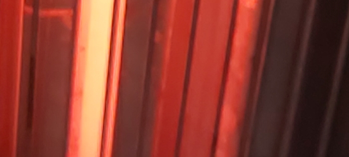The image displays a close-up, abstract view of a surface comprised of multiple horizontal, parallel bands. The upper portion of the image features bright orange-red bands, which transition into deeper, duller red tones, then reddish-brown, and finally dark brown to black bands towards the bottom. The bands suggest a louvered, slatted, or corrugated structure, possibly a window blind, shutter, or wall paneling. The lighting is characterized by an intense reddish hue, particularly prominent in the upper and middle sections, creating a strong color gradient and obscuring fine detail due to apparent soft focus or blur. No individuals, specific objects beyond the primary banded structure, actions, or interactions are visible. The scene is located in the city of Unknown, Unknown.