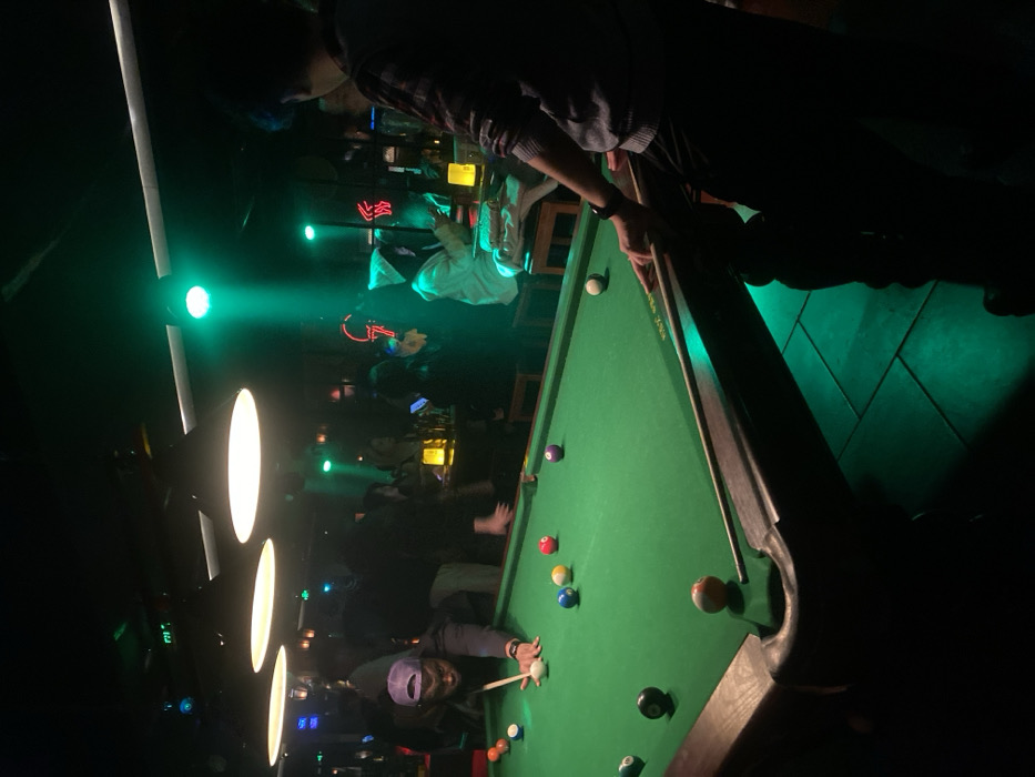 A billiards table dominates the scene, with balls scattered across its green felt