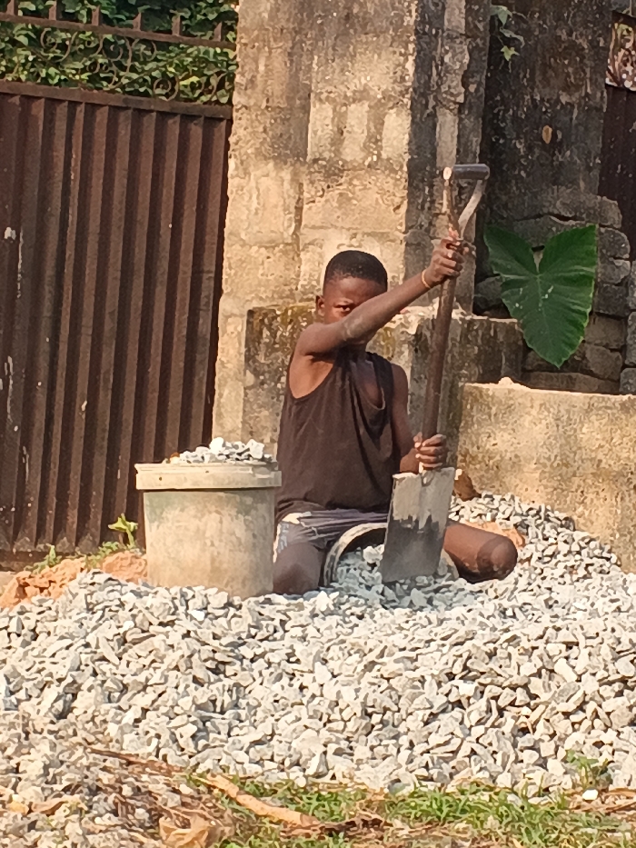 A young Black male is depicted kneeling on a large pile of light grey crushed stone in Eziudo, Nigeria