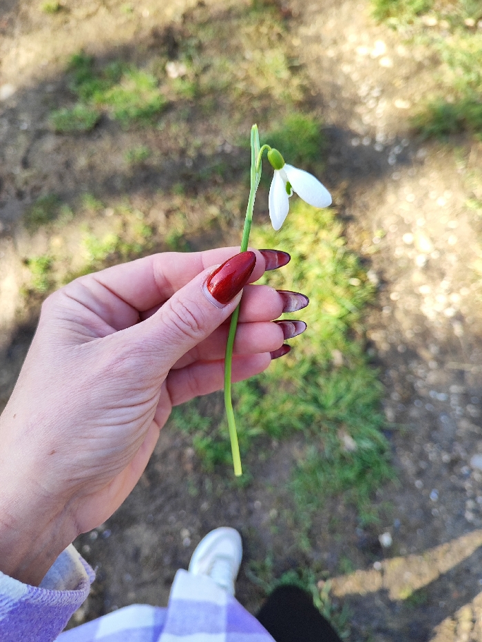 A close-up, downward-angled view captures a fair-skinned human hand firmly gripping the green stem of a single white snowdrop flower. The hand displays manicured nails, shaped in an almond style, coated with dark red polish. The snowdrop exhibits characteristic white, bell-shaped petals. The background is a softly blurred outdoor ground, consisting of patches of green grass and exposed brown soil, illuminated by natural light which casts subtle shadows. The lower portion of the image reveals a partial view of a white sneaker and a light-colored, possibly checkered, lower garment. The scene is situated in Орлиновский округ, Ukraine.