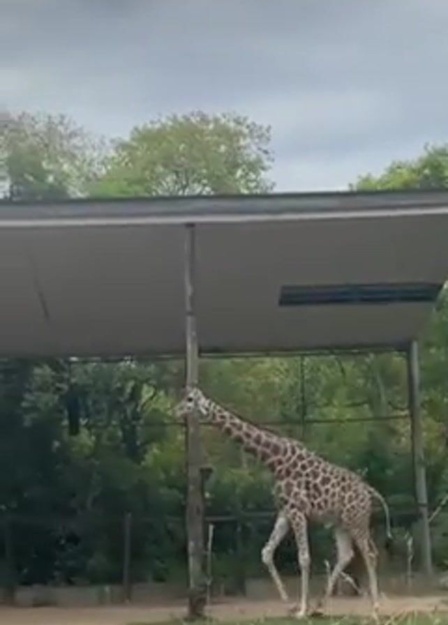 - "giraffe walking under a sheltered area with a light gray roof" by FM-FOdGg1, licensed under CC BY 4.0