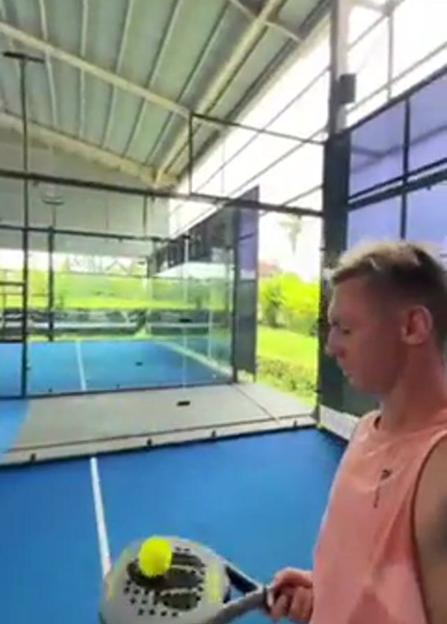man playing paddle tennis indoors. The man is fair-skinned with short bleached blond hair and is wearing a salmon-colored tank top. He is holding a gray paddle tennis racket and hitting a yellow ball in front of him. The court is blue and is surrounded by glass walls. There is another paddle tennis court visible behind the first one. The building has a high, light-colored corrugated metal roof. The man looks at the camera a few times throughout the video.