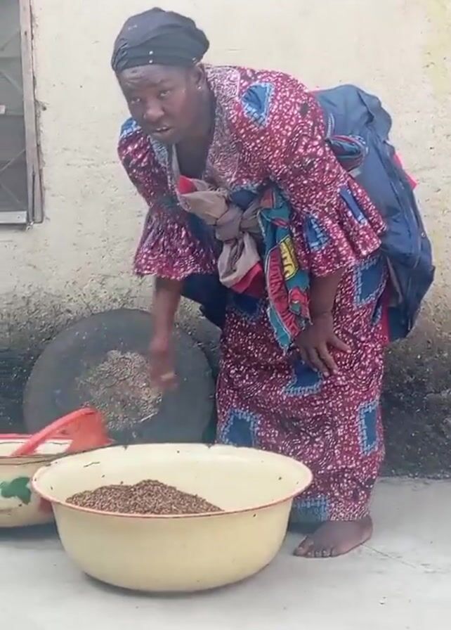 A woman in a patterned dress and headscarf, carrying a baby on her back, lifts a large yellow basin filled with grains. She stands outside a building with a window, tire, and other containers. She lifts the basin and carries it towards a doorway covered with a curtain.