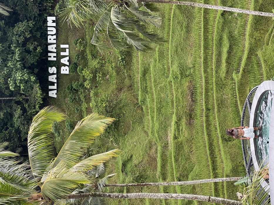 The scene depicts a tropical landscape located in the city of Tegal Suci, Indonesia. A prominent sign on the upper hillside displays "ALAS HARUM BALI" in white block letters amidst dense green foliage. Below this, extensive, vibrant green rice terraces cascade down the steep slope, framed by two tall palm trees on either side. In the lower left foreground, a dark grey circular plunge pool with a black mesh railing contains an adult male. He has long dark hair, a beard, is shirtless revealing chest and arm tattoos, and wears light-colored swim shorts, standing with his lower legs submerged. A second individual's left arm and shoulder are partially visible at the far left edge of the pool.
