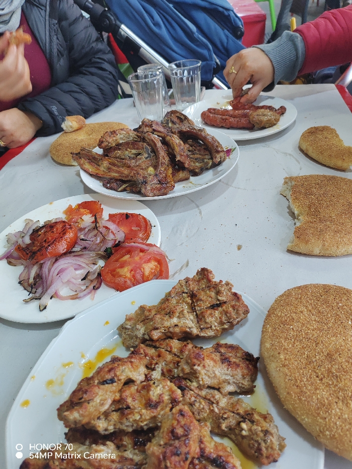 - "A table covered with a white tablecloth presents an array of plates filled with various grilled meats, sausages, and a salad of tomatoes and onions" by FM-z9Q8u2, licensed under CC BY 4.0