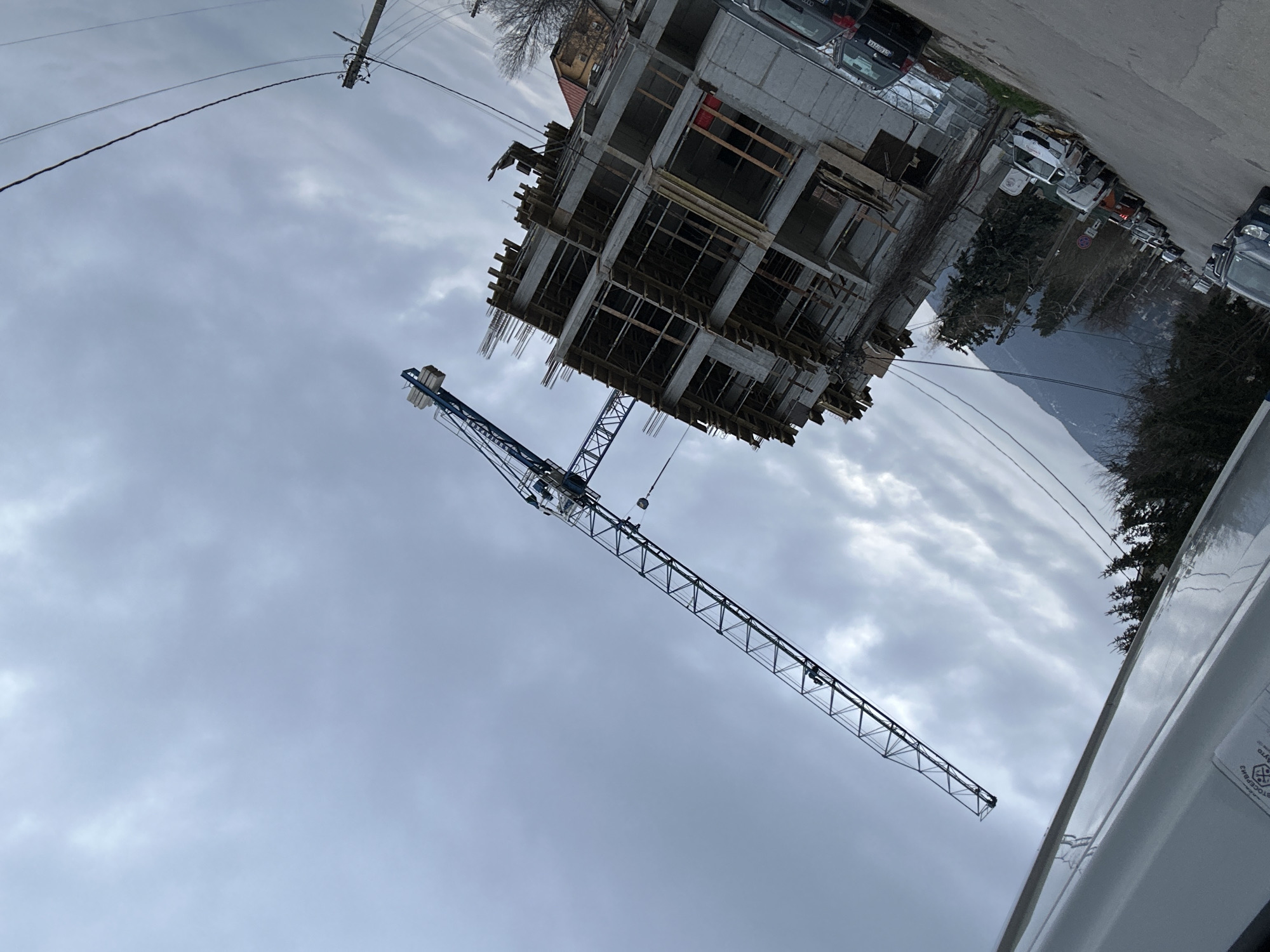construction site in Sofia, Bulgaria. A multi-story concrete building under construction is visible, along with a large blue construction crane. The sky is overcast. A mountain is visible in the distance. Cars are parked on the street next to the construction site. Utility lines are also visible in the sky. The lower right corner of the image contains a portion of a white vehicle.