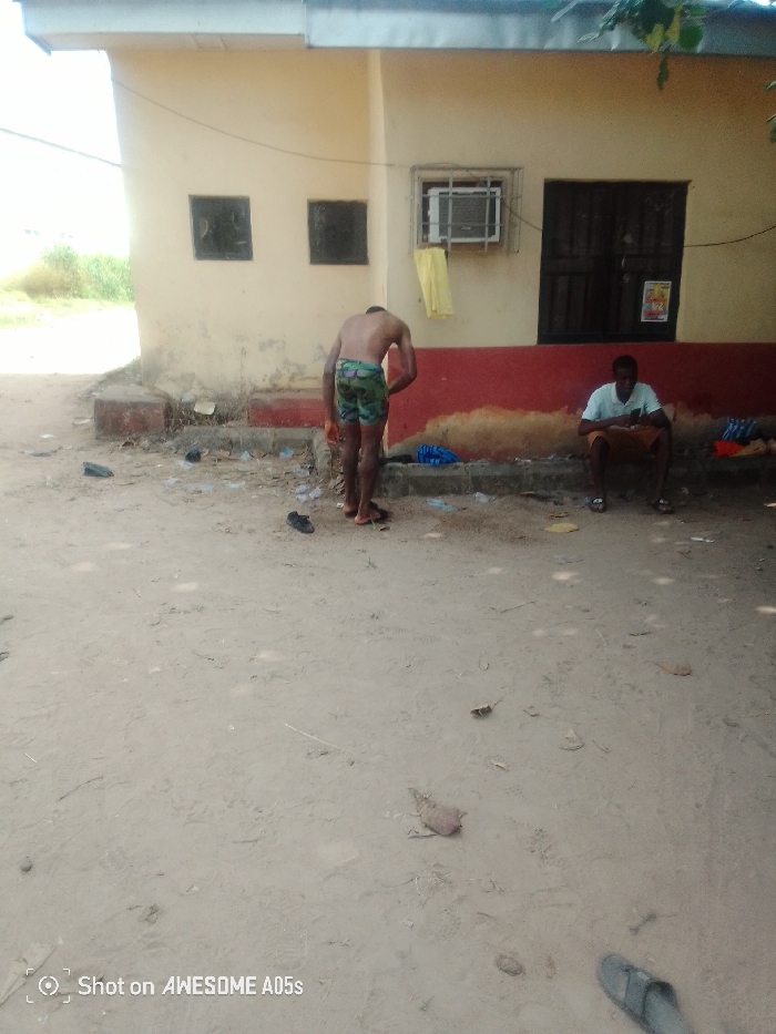 Two men are outside a building. One man, shirtless in patterned shorts, stands facing the building. The second man is sitting down against the side of the building and is dressed in a shirt and shorts. The ground is sandy and scattered with litter. The building is beige with a red trim around the base. There are barred windows and an air conditioning unit. A towel hangs from the AC unit. A poster is visible on the door of the building.
