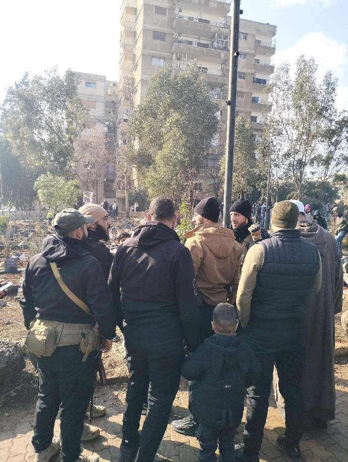 This daylight image, captured in an urban area of Homs, Syria, depicts a group of individuals in an open space adjacent to residential buildings