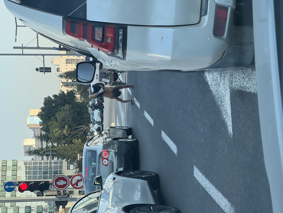 The image depicts an urban street scene in Tel Aviv, Israel, specifically on Menachem Begin Road approaching the intersection with Carlebach Street, looking southbound. Traffic is stopped at a red light during clear daytime conditions. In the foreground, a shirtless adult male is performing a handstand in the middle of a traffic lane. He has dark hair or a beard, is wearing dark shorts or pants, white socks, and dark shoes, with his legs bent and feet raised. To his immediate right, on the shoulder or curb of the road, a wheelchair is positioned, facing the same direction as traffic, and contains what appears to be personal belongings. The road is a multi-lane asphalt thoroughfare, with white dashed lines separating the lanes and a white triangular arrow painted on the asphalt in the lane where the individual is performing, indicating a straight-ahead movement. Vehicles are stopped in all visible lanes. The image is taken from inside a vehicle, with its dashboard visible at the bottom. To the right, the rear of a white Toyota Land Cruiser Prado SUV is stopped. To the left, the rear-left side of a white modern car (possibly a Tesla Model Y) is stopped, followed by a dark gray Volkswagen Passat sedan. Further down the road, additional cars and motorcycles are stopped in a line of traffic. On the far left, a vertical traffic light pole displays a red circular light at the top and a green straight-ahead arrow below it. Attached to the pole are two circular red signs: an upper "STOP" sign with a white hand symbol for pedestrians, and a lower "NO LEFT TURN" sign. The background features a skyline of various urban buildings, including modern glass high-rises on the far left, characteristic of the Azrieli Center area. Other multi-story commercial or residential buildings are visible, with one distant building in the center-right having a faint blue sign or billboard on its upper floors. Green trees are interspersed among the buildings under a light blue sky.